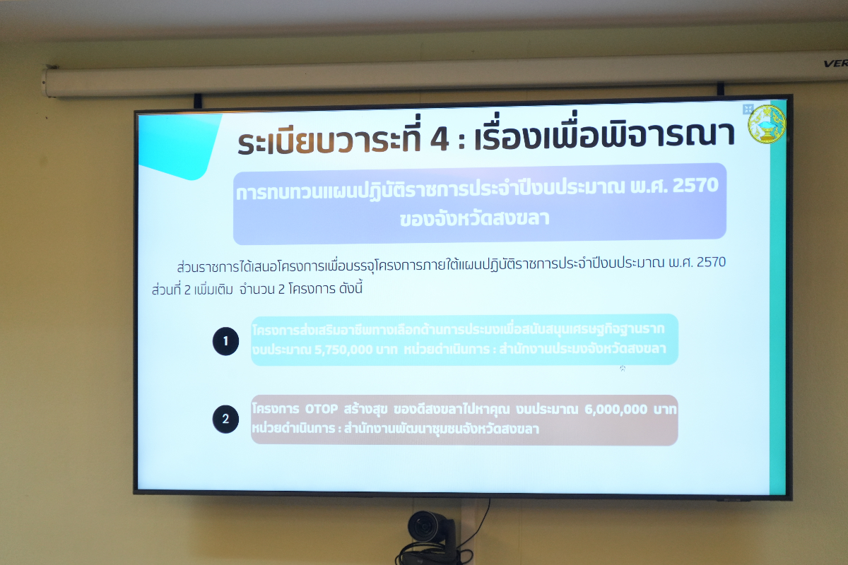 การประชุมดังกล่าวเพื่อติดตามผลการดำเนินงานและการเบิกจ่ายงบประมาณภายใต้แผนปฏิบัติราชการ ประจำปีงบประมาณ พ.ศ.2568 ของจังหวัดสงขลา จำนวน 24 โครงการ 1 รายการ ดำเนินการแล้วเสร็จ 13 โครงการ อยู่ระหว่างดำเนินการต้องกันเงินเหลื่อมปี จำนวน 11 โครงการ พร้อมร่วมพิจารณาการทบทวนแผนปฏิบัติราชการ ประจำปีงบประมาณ พ.ศ.2570 ของจังหวัดสงขลา จำนวน 53 โครงการ 1 รายการ แยกเป็นโครงการสำคัญ (ส่วนที่ 1) จำนวน 32 โครงการ โครงการอื่น ๆ (ส่วนที่ 2) จำนวน 21 โครงการ 1 รายการ โดยส่วนราชการที่เกี่ยวข้องได้เสนอโครงการเพื่อบรรจุโครงการภายใต้แผนปฏิบัติราชการ ประจำปีงบประมาณ พ.ศ.2570 ส่วนที่ 2 เพิ่มเติม จำนวน 2 โครงการ ดังนี้ โครงการส่งเสริมอาชีพทางเลือกด้านการประมงเพื่อสนับสนุนเศรษฐกิจฐานราก และโครงการ OTOP สร้างสุข ของดีสงขลาไปหาคุณ